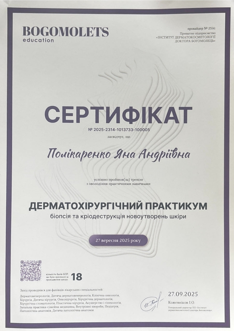 - Біопсія та кріодеструкція новоутворень шкіри Інститут дерматокосметології доктора Богомолець - 09.2025