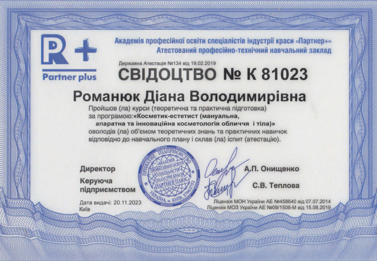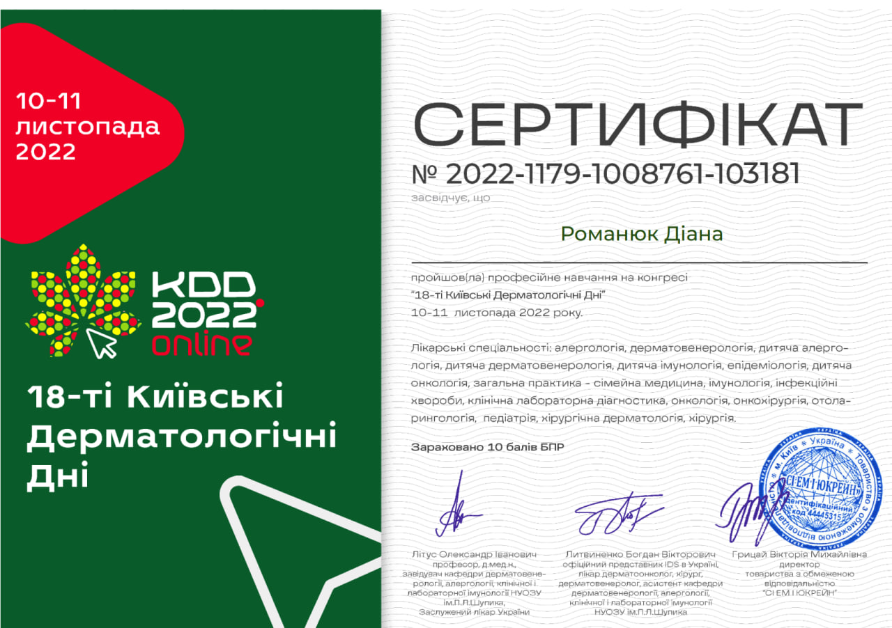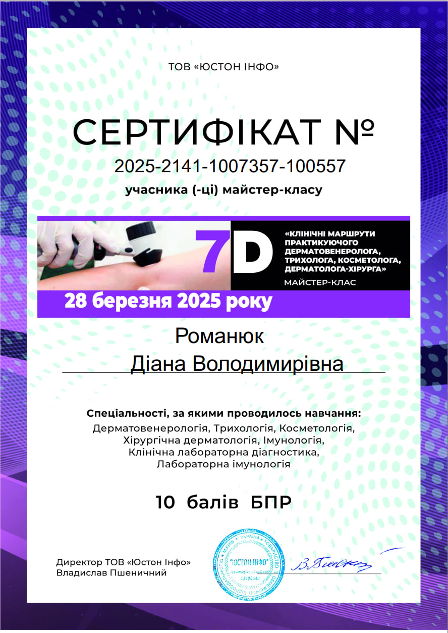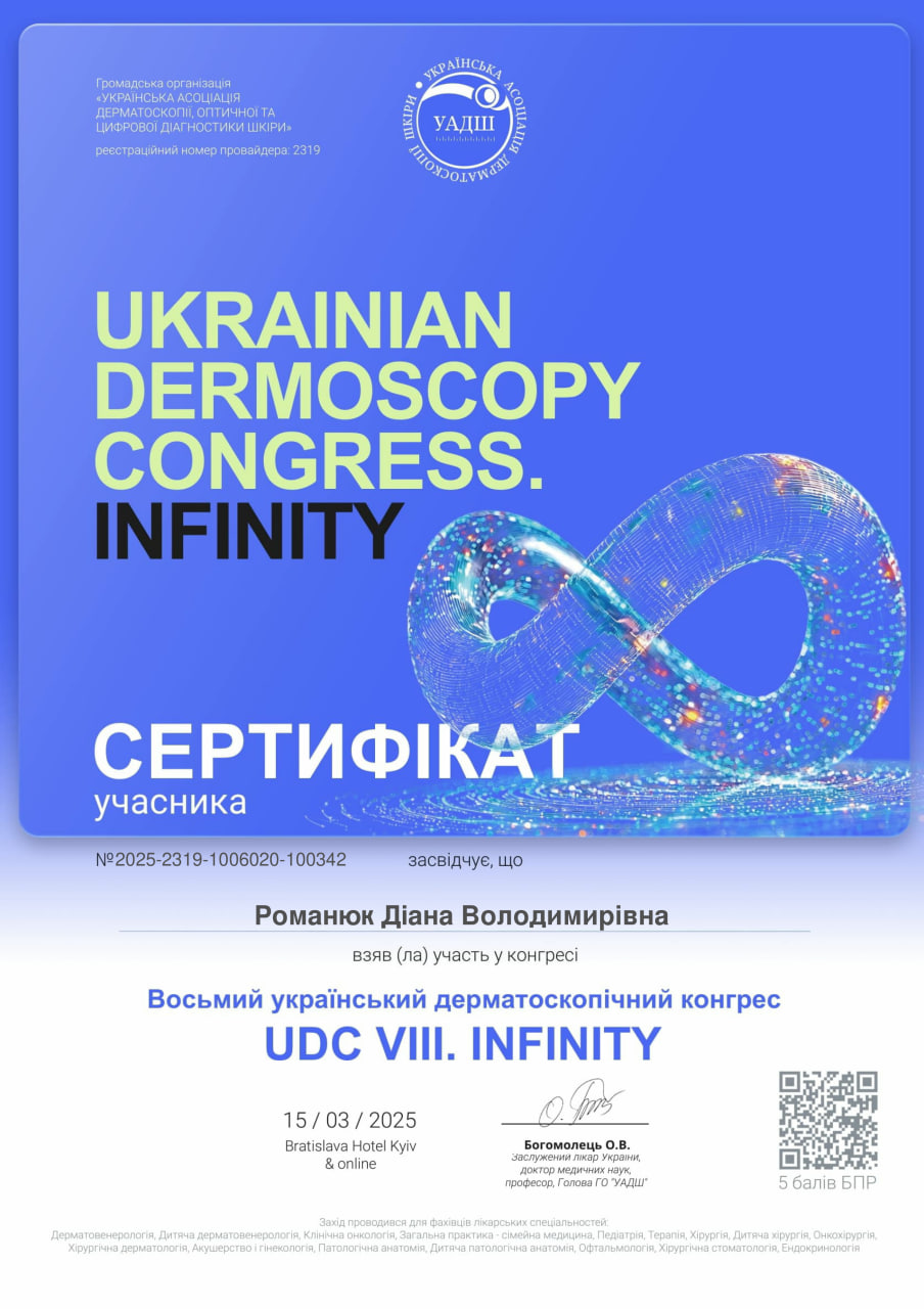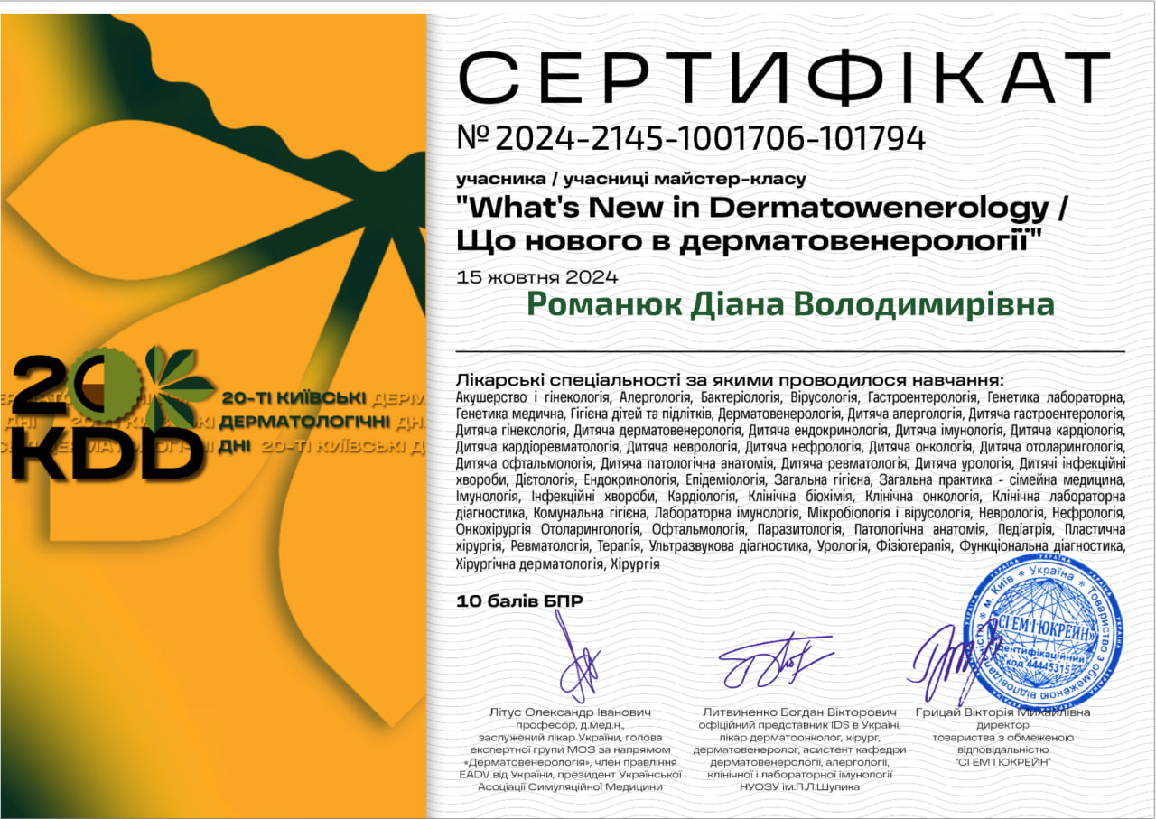 - Спеціалізація з дерматохірургії на базі міжнародного Європейського університету