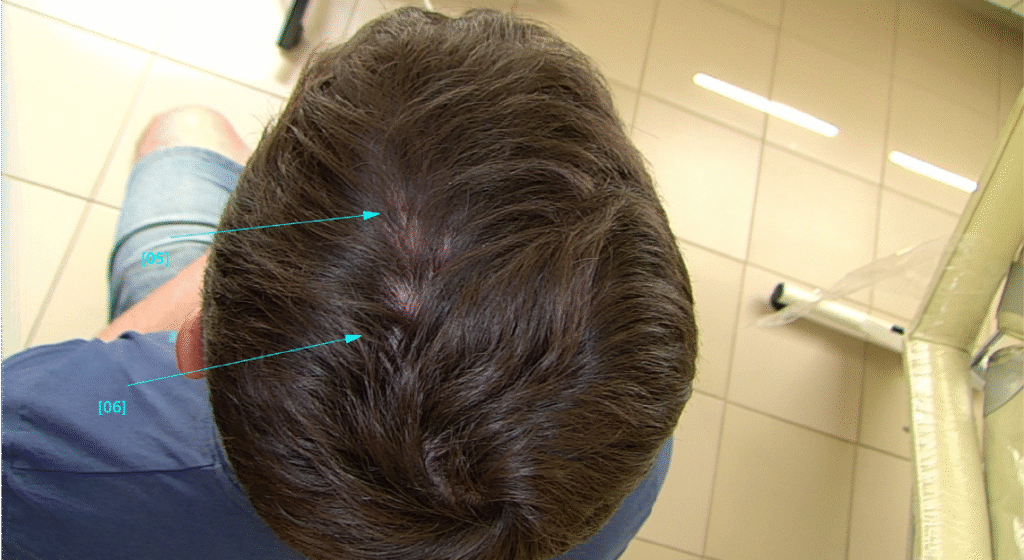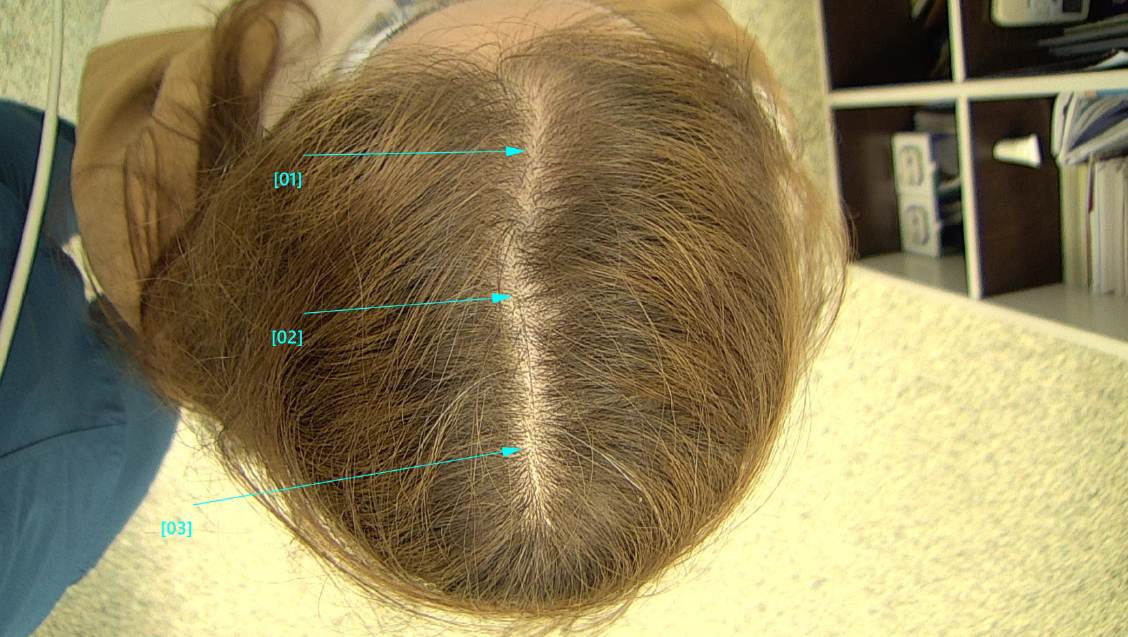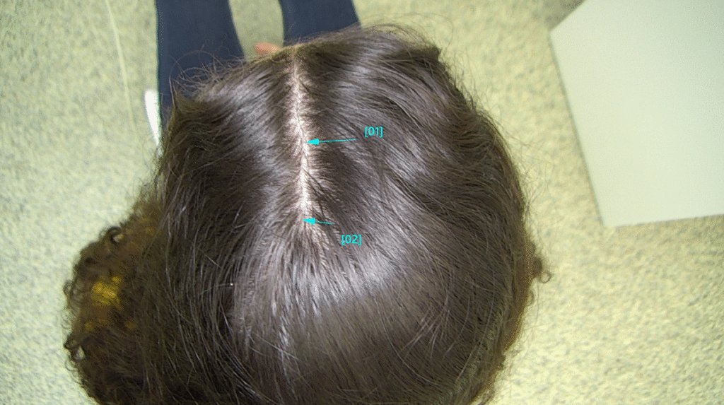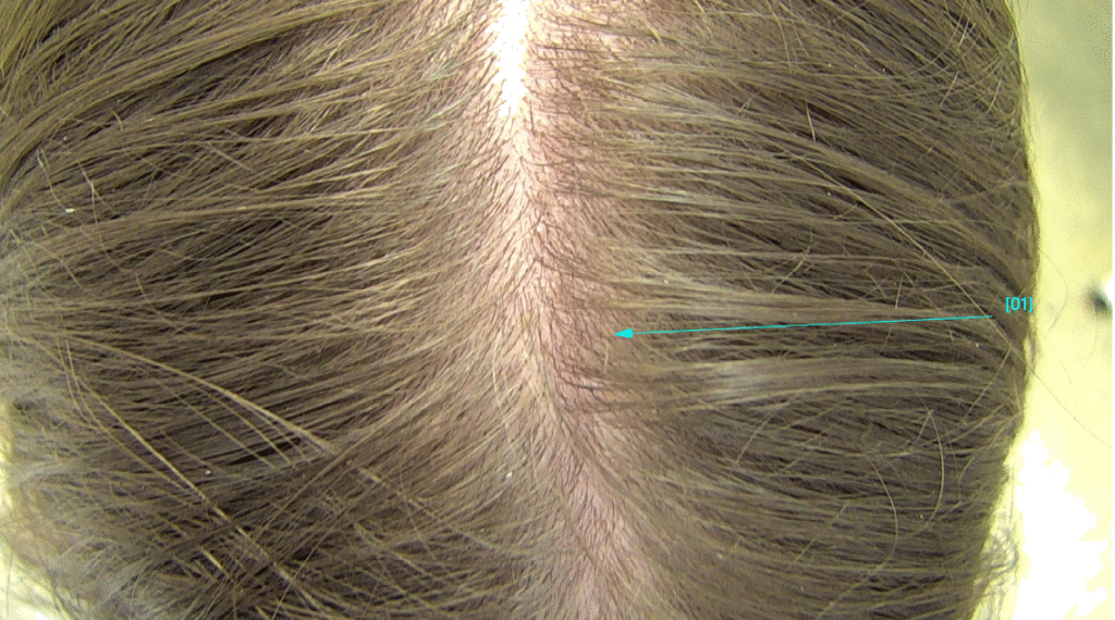Цифрова трихоскопія FotoFinder – діаметр волосин одинаковий, присутнє дифузне перифолікулярне лущення, з кожного фолікула росте по 2-3 волосини, активні зміни між гормон залежною та гормон незлежною зонами – відсутні, місцями – почервоніння, на шкірі в/ч голови – що свідчіть про запальний процес.