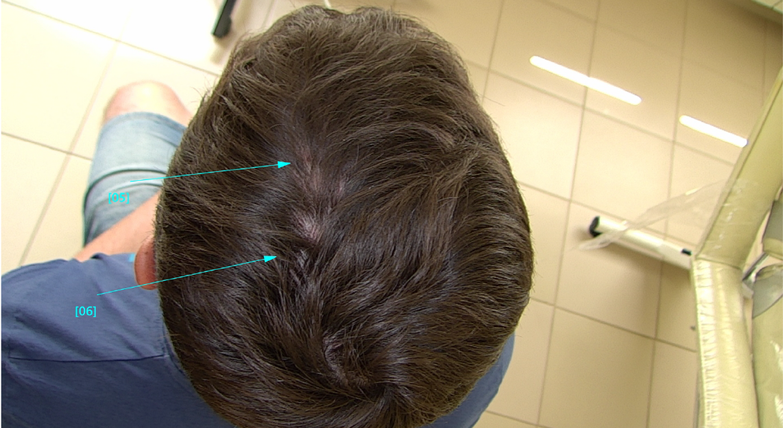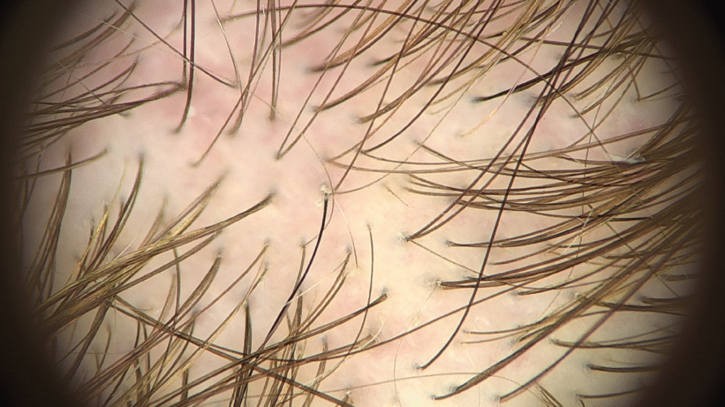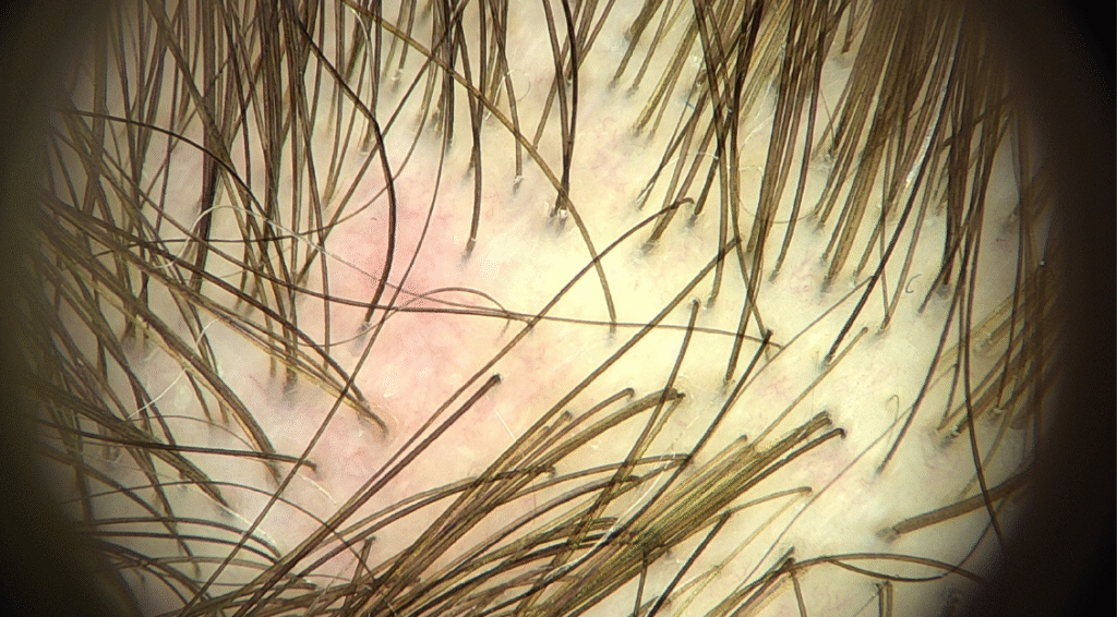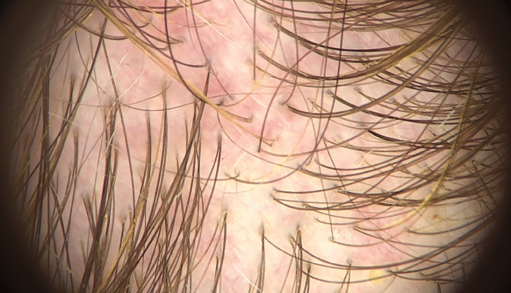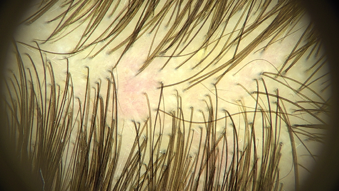 Трихоскопія на FotoFinder – зони еритеми, одиничні волосяні стержні.