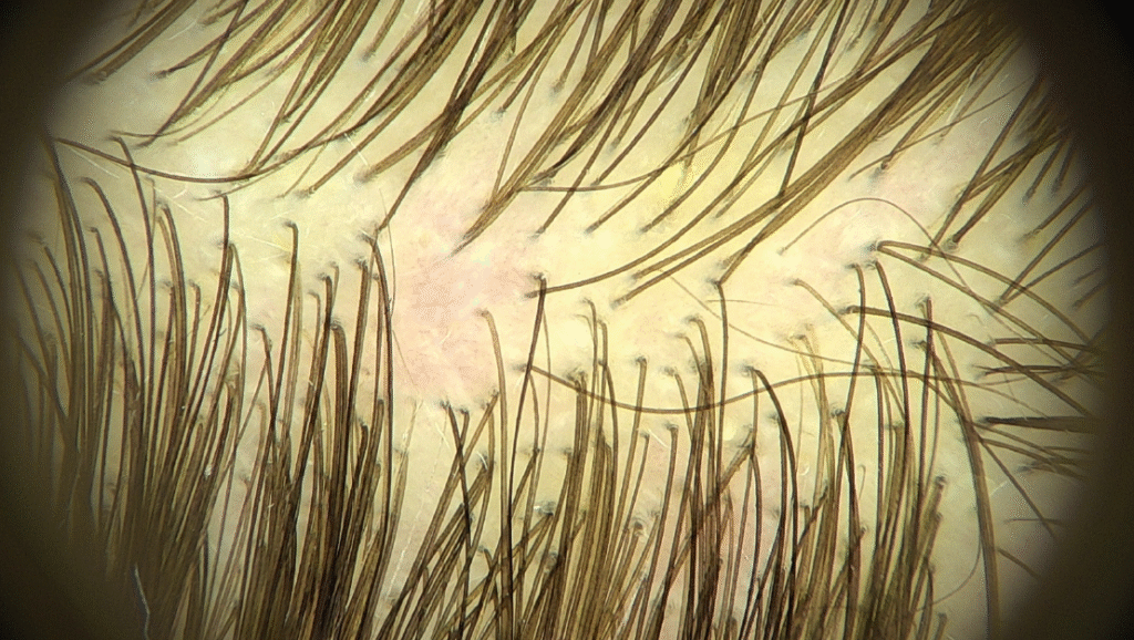 Трихоскопія : множинні одиничні волосяні стержні, одиночні відростаючі волосяні стержні .